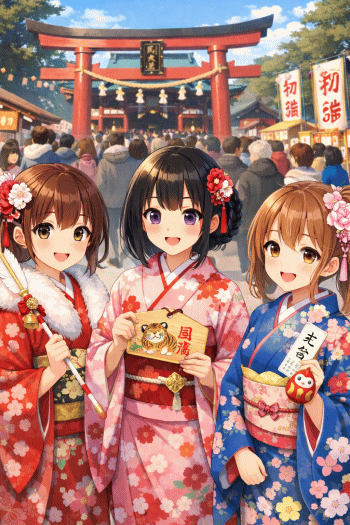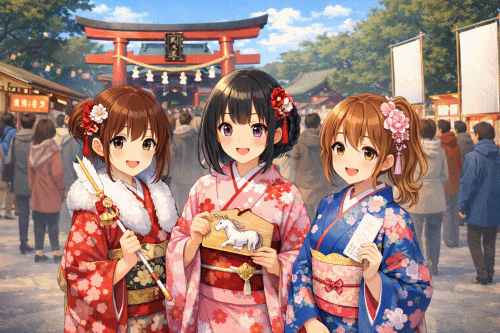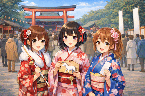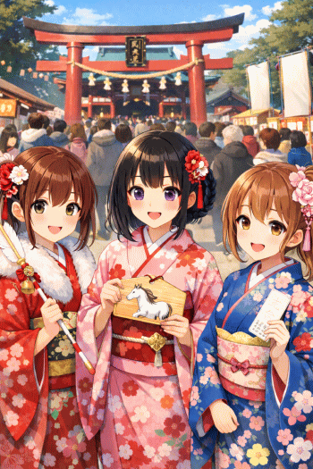 ついでに、今年の干支が間違っています。絵馬のトラをウマに変えましょう。あと右側の子が指に付けているダルマ(指輪なの?)も消しましょう。