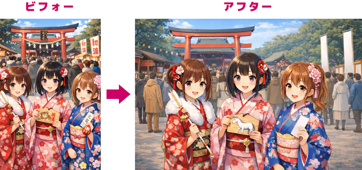画像編集の経過を見ると、アハ体験のように違いがよく分からなかったと思いますので、以下ビフォーアフターを載せておきます。