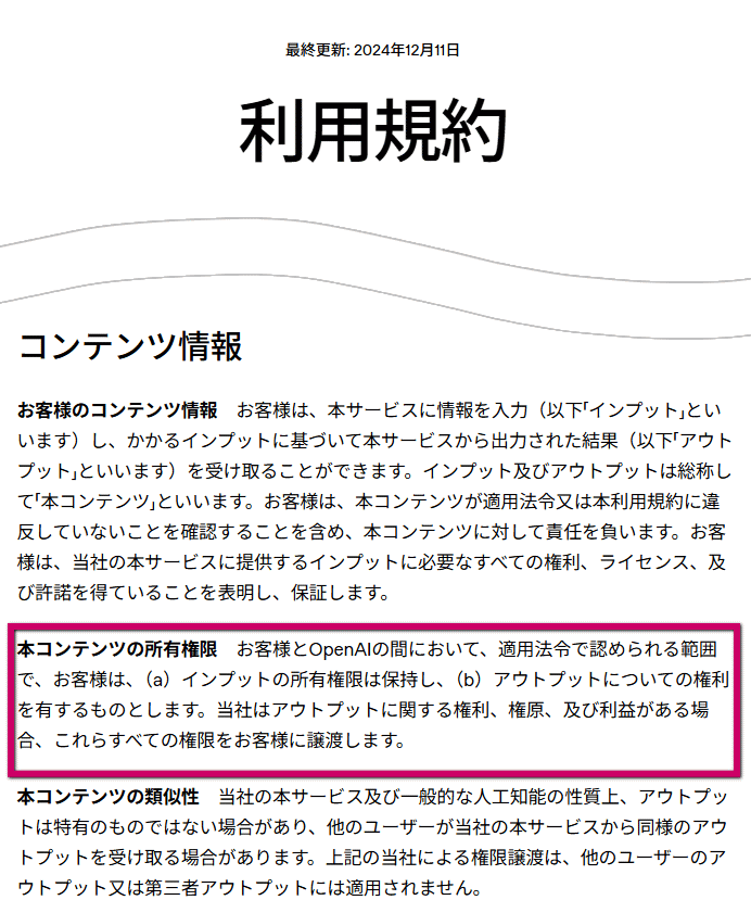 また利用規約は変更される場合がありますので、ChatGPTをご利用になる際はつど確認されることをお勧めいたします。