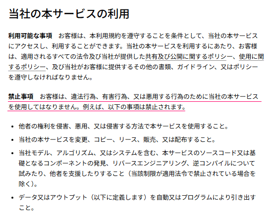 同ページには、サービスの利用にあたり禁止事項も書いてあります。