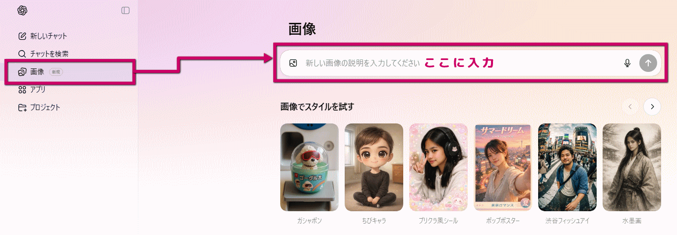 ❷ 左メニューの「画像」を選択し、右のフォームに日本語で入力をすれば画像が生成できます!「えっ、これだけ?」と思うくらい、とても簡単!