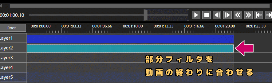 動画の終わりまでモザイクを掛けたままにしておきたければ、部分フィルタも最後の位置まで伸ばしましょう。