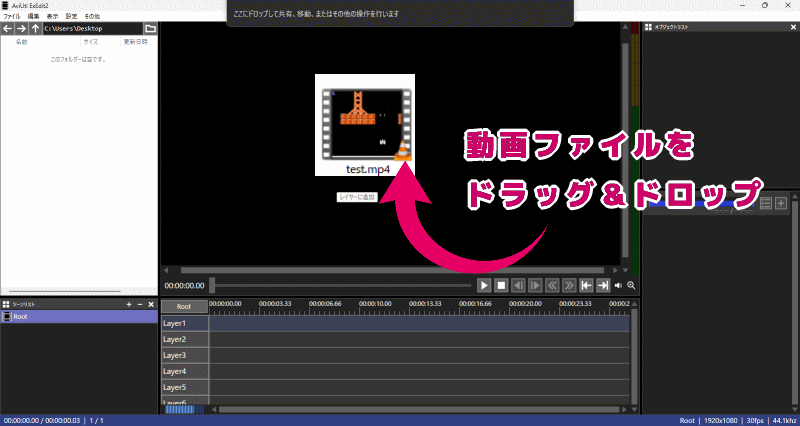 動画ファイルを『AviUtl ExEdit2へ、ドラッグ&ドロップします。