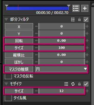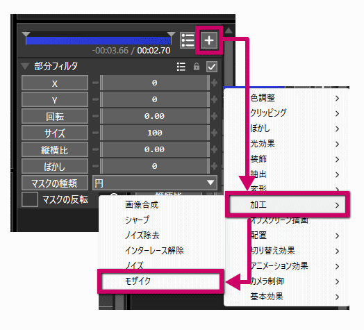 右側に「部分フィルタ」のオブジェクトが表示されるので、「+」ボタンを押し、「加工」→「モザイク」を選択。