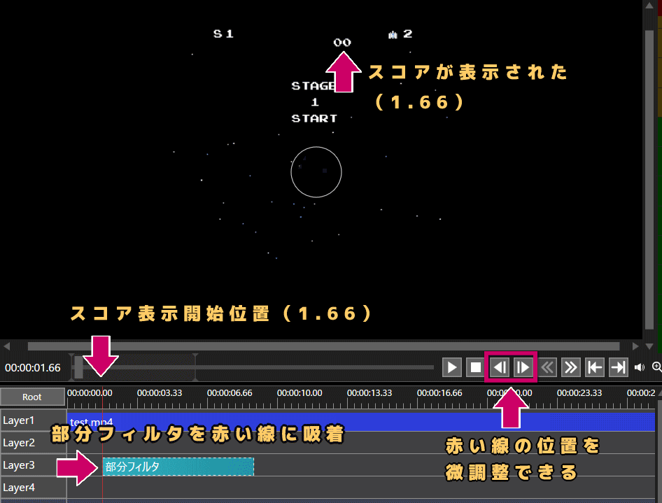 まず、動画にスコアが表示される時間(1.66)に、赤い線を移動させます。四角で囲んだ2つのボタンで微調整できるので活用しましょう。