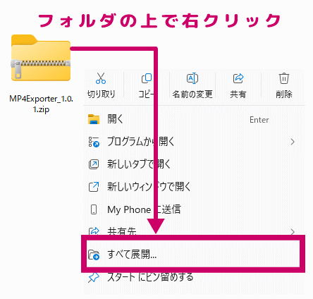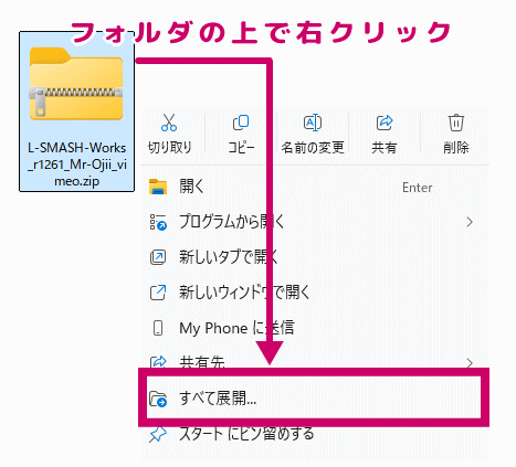 ❸ ダウンロードされたzipフォルダの上で右クリック →「すべて展開」を選択。