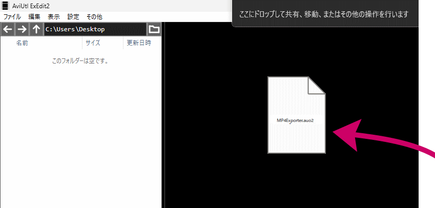 ❹ フォルダ内にある「MP4Exporter.auo2」ファイルを、AviUtl ExEdit2(黒い部分)にドラッグ&ドロップする。