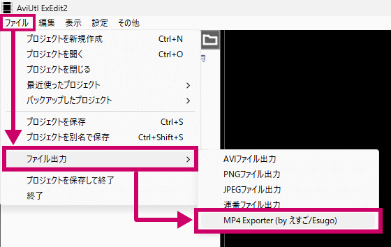 ❻ 「ファイル」→「ファイル出力」と選択し、「MP4Exporter」の表示があればOK!