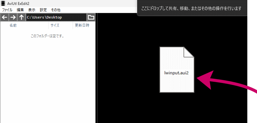 ❺ フォルダ内にある「lwinput.aui2」ファイルを、AviUtl ExEdit2(黒い部分)にドラッグ&ドロップする。