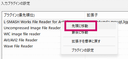 ❽「L-SMASH Works」の上で右クリック →「先頭に移動」を選択。