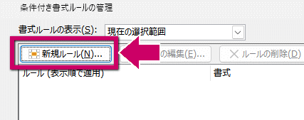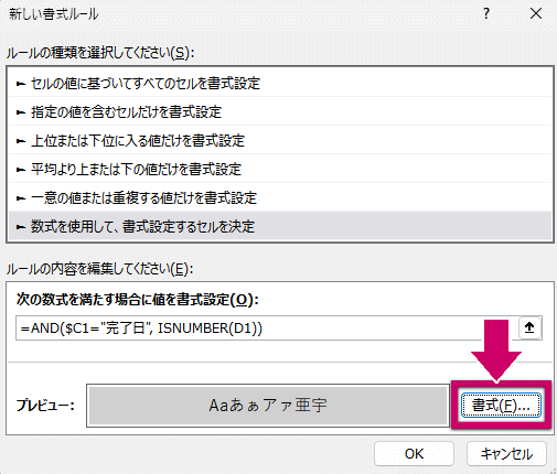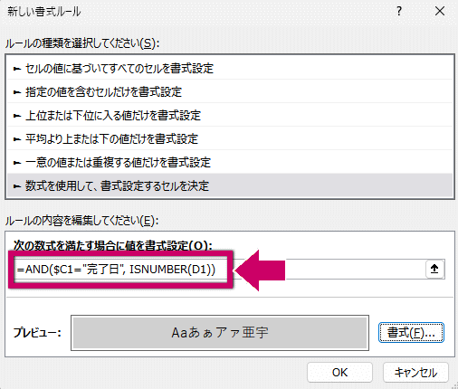 予定日(完了日の1つ上のセル)にも色を付けたい場合には、もう一つ新しい書式ルールを設定します。