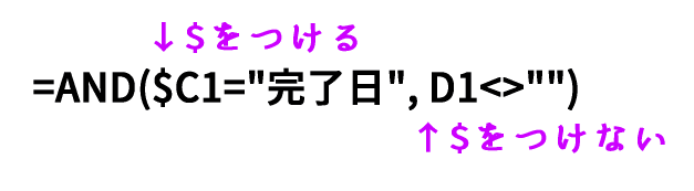 特定文字(C1)の場合、Cの前にだけ$を。入力セル(D1)には$をつけないようにします。実際にお試しいただくと分かりますが、こうしないと色が付きません。