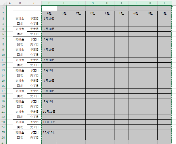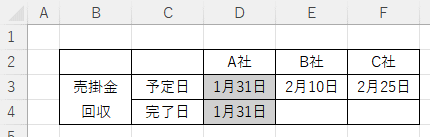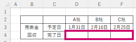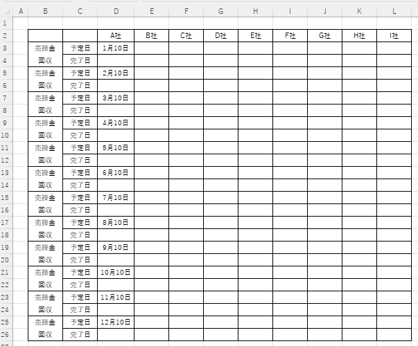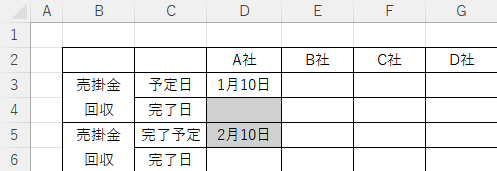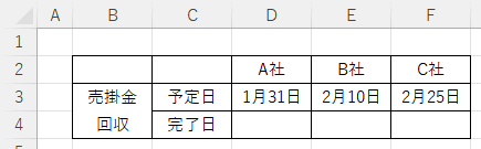 そこでエクセルで表を作成し、売掛金回収の「予定日」および「完了日」の項目を設けました。