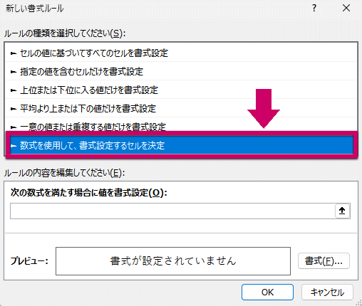❹「数式を使用して、書式設定するセルを決定」を選択。