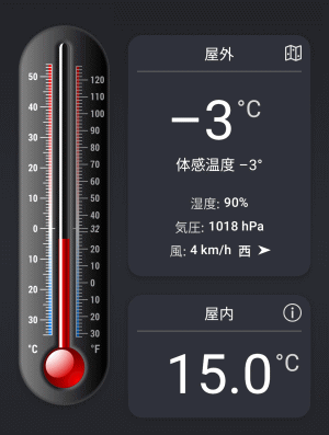 あまりに寒いから、気温アプリ入れて計ったら室温15度って……かかってるエアコン代!この日は外が-3℃で、少し暖かかったはずなのにこの有様。