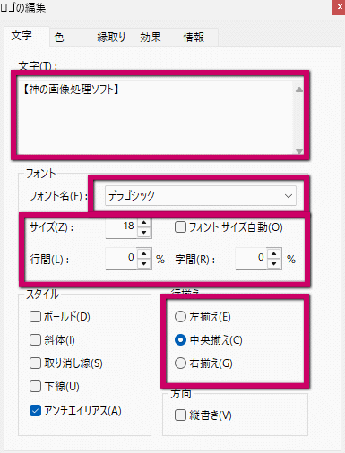 入力編集・フォント選択・位置・文字サイズ・行間・字間もすべてここで変更できます(サイズは画像と同じように、マウスでも変更できます)。