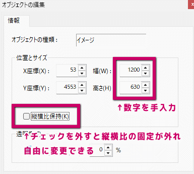 ❹ 大きさを整えます。せっかくですので、背景は推奨サイズ(1200×630)にしてみましょう。画像サイズは、画像をダブルクリックして出てきたダイアログボックスで変更できます。