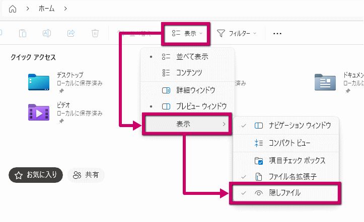 ❷ 上のメニューバーから「表示」→「表示」→「隠しファイル」の順に選択し、チェックを付けます。