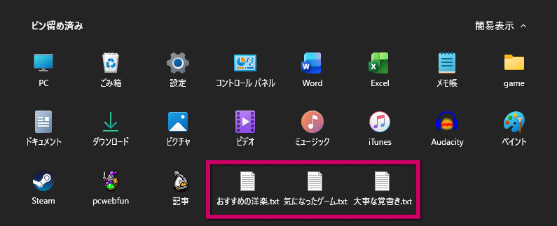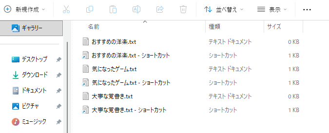 txtの後ろの「-ショートカット」を消しておくと、ピン留めしたときスッキリします。