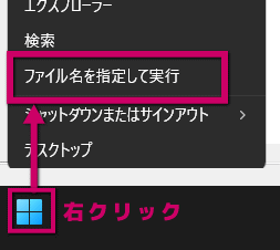 もしくはwindowsのアイコン上で右クリック→「ファイル名を指定して実行」を選択し、
