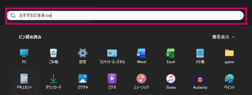 ❻ スタートメニューの上にある「検索」に該当ファイル名を入力(コピペ)します。