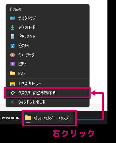 ❷ タスクバーにフォルダが表示されますので、フォルダの上で右クリック