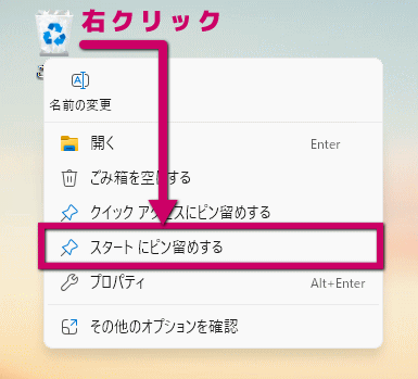 ❶ ごみ箱の上で右クリック →「スタートにピン留めする」を選択します。