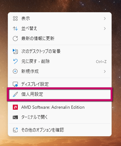 ❷ デスクトップ上で右クリック →「個人用設定」を選択。