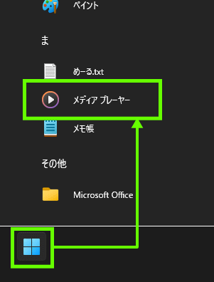 ❶ windowsボタンをクリック → 「ま行」のメディアプレーヤーを開きます。