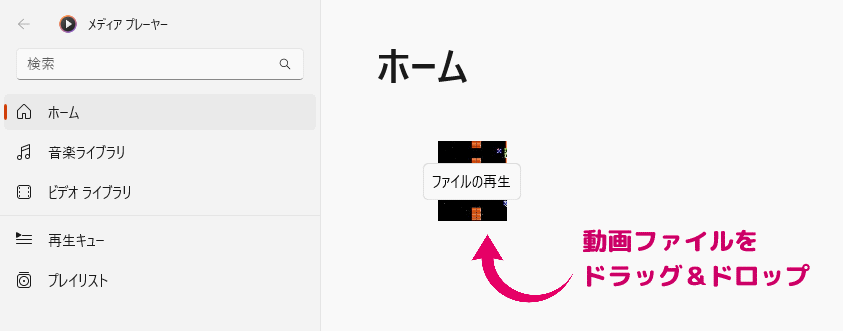 ❷ 開いた画面に、動画ファイルをドラッグ&ドロップすると読み込まれます。