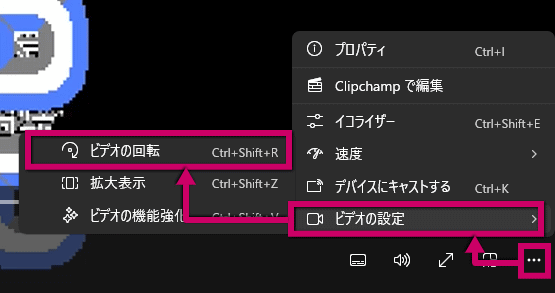 ❹「3点リーダー」→「ビデオの設定」→「ビデオの回転」と選択します。