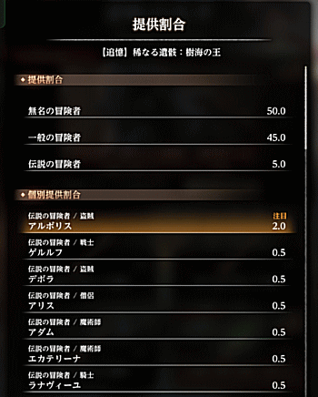 アルボリスの提供割合は、伝説の冒険者5%のうち、2%。