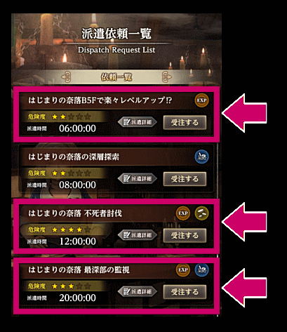 特に「奈落B5Fで楽々レベルアップ!?」は派遣時間が短いので回転が速いし、比較的早い段階で派遣に出てくるのもいい。